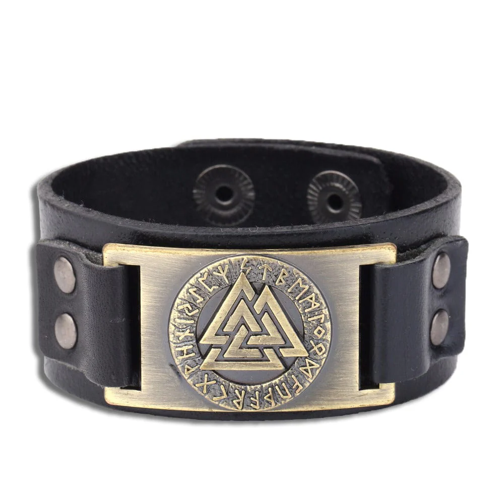 Ce bracelet en cuir vĂ©ritable est ornĂ© du symbole le plus mythique de la culture viking : le Valknut.Â